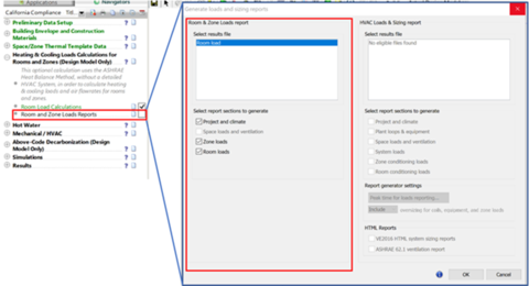 After running the Room Load Calculation, report(s) can be generated by selecting one of the result files from the available list of files. The user has an option to generate the whole report or only a section of the report.