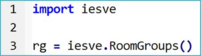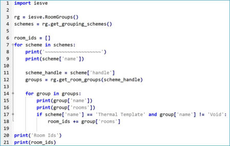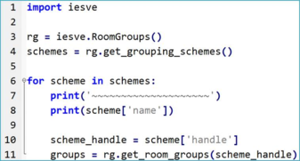 Create an instance of the RoomGroups interface object using ‘iesve.RoomGroups()’ and assign it to a variable. The variable can be named anything. In this example we will assign it to the variable named ‘rg’. The RoomGroups interface object will allow us to interact with the Grouping Schemes in the VE model.