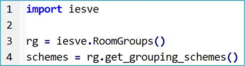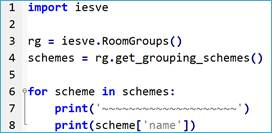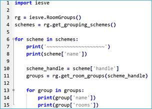 We will essentially be creating a list of dictionaries. To do this we will call the ‘get_grouping_schemes()’ method on the RoomGroups object. We will then assign the list of grouping schemes to another variable. In this example we will name this variable ‘schemes’.