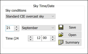 By default, the sky file has an automatically generated name in the following format: Sep21_1200_cie.sky This has a 3-character mnemonic for the month, the day of the month, the time and the sky condition used. When an image is created this information is stored in the image header and displayed in the image summary information. See View Images tab.