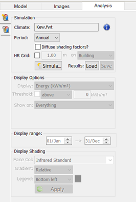 The Solar Analysis feature allows you to visually evaluate the sun intensity and exposure of your building’s façade in 3D (using Model Viewer II) over a specified time period and at a more granular level of detail if required. This can be used, for example, to assess your building for potential placement of PVs; access to sun, pedestrian comfort and landscaping. Access to this feature is through the Analysis tab as seen below.