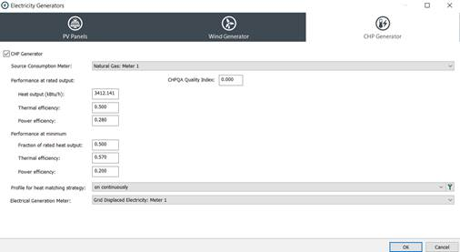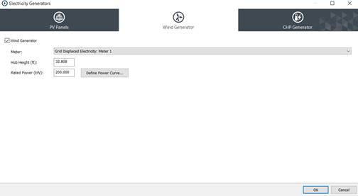 This action displays the ‘Electricity Generators’ dialog. Here the user can setup renewable energy systems like wind and CHP generators.
