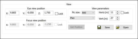 This is used to set the eye and focus positions, picture size, picture horizontal and vertical angles/sizes and view perspective. This group has two sub-groups: Eye/Focus view position and View Parameters: