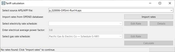 This action allows users to import tariff structures from the OPENEI online database and perform a post process tariff analysis on a set of Apache simulation results.