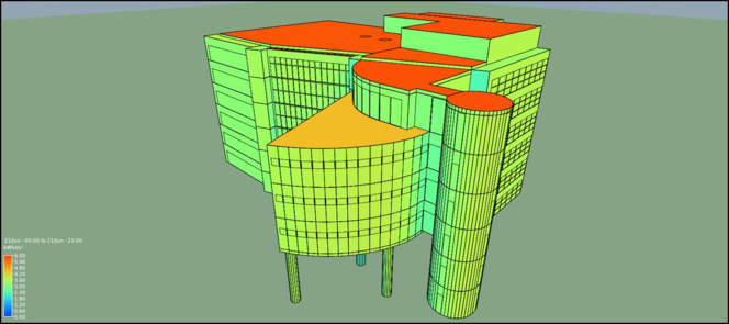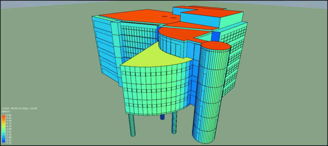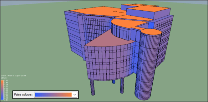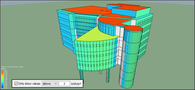 The second option allows to you to filter results by only applying colour to surfaces that: have values above or below a certain threshold; or have values within or outside a certain range. This could possibly be used to easily identify hot or cold spots on the façade of your building. For example: