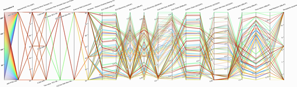 Figure: Parallel Coordinate Plot (PCP) showing the impact of variations to the Armstrong Templok Tile amongst other parameters