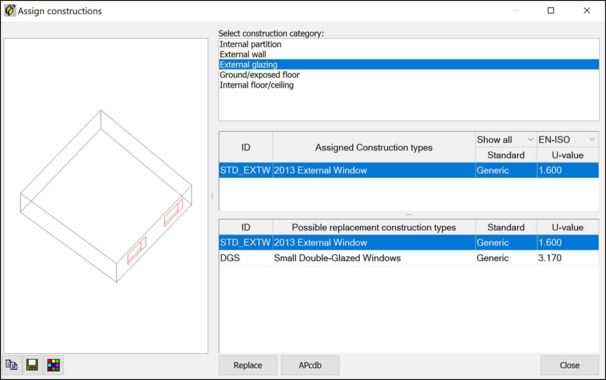 In the Select Construction Category box, the required Category is selected, and the assigned construction types will appear in the box below it. These are types assigned in the model. As each type is selected, the preview of the model will be shown in red to indicate where this construction type is in use. In the bottom box, the user can select a replacement for the construction type selected in the middle box. The Replace button will make the required change. The APcdb button will start APcdb if needed.