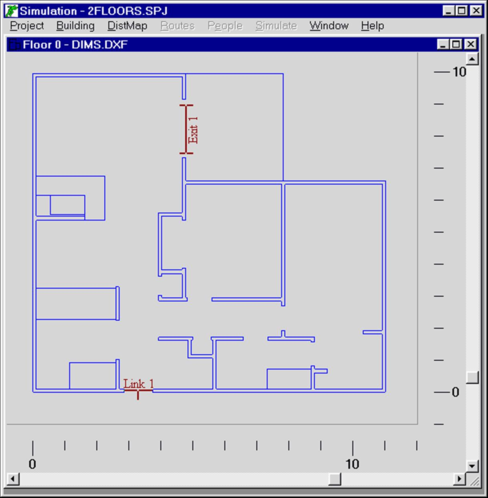 To add a floor, you import a DXF drawing file created with a standard CAD program. However, when you create the DXF file you must delete all information which is not relevant to the building shape - only the walls must be left. All other information such as door swing lines, text and other irrelevant lines must be deleted in advance, otherwise the simulation cannot proceed. Simulex uses the wall lines to define the physical space available for evacuation. Building contents can of course exist on the drawings if the location of those are known in advance, but remember that all physical objects are regarded as immovable. Each new floor plan is assigned, and displayed in, a new window. The contents will obstruct the occupants trying to evacuate. A sample screen display from Simulex is displayed below.
