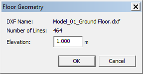 To add a floor, use the Menu Item: Building > Add Floor, which activates the DXF filter. You will need to specify the file name and location. Simulex analyses the file, and then will ask you what units the file is stored in, because this information is not specified in the DXF file (see Figure 2). Normally, this will either be meters or inches. To check if you have used the right units of measurements, you should compare the size of the plan when it is drawn in the display window, to the meters scale drawn on all sides of the plan. If it is displayed at the wrong scale, then you will need to delete the floor plan, using Menu Item: Building > Delete, and then re-import the DXF file with a different scale. Usually, when you have found the correct units, this will be okay for all DXF files created on the same CAD package. Once the DXF import has completed you will be presented with the Floor Geometry dialog (see Figure 3). This will display the name of the DXF, how many lines were imported and what elevation (i.e. height) the floor is at. The height is important for viewing your project in 3D (see 8.5.3). A maximum of 100 floors can be added.