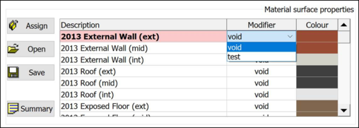 To assign a pattern to a given surface, select the surface from the Material surface properties list and click its Modifier field. A drop-down list of all available modifiers in the project will appear. Select the pattern you wish to apply to the selected surface.