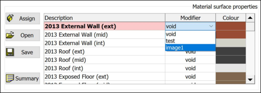 To assign an image to a given surface, select the surface from the Material surface properties list and click its Modifier field. A drop-down list of all available modifiers in the project will appear. Select the image you wish to apply to that selected surface.