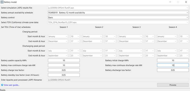 Battery storage is now part of the proposed model and acts upon the proposed results that have been created previously. This action displays ‘Battery Storage’ dialog which allows the user to edit battery storage properties and perform a post process analysis on a set of Apache simulation results.