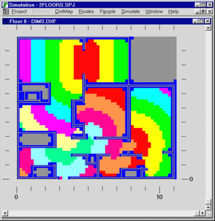 A ‘distance map’ consists of a mesh of 0.2 by 0.2m spatial blocks, which is used to represent a ‘low-resolution’ form of the total building space. The numerical value assigned to each block is equal to the total travel distance to an exit from that block. Simulex is able to calculate a distance map when at least one exit has been defined for a building.