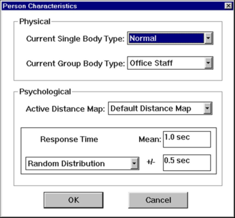 The occupant response times are also entered in the Characteristics box. The times are defined by a mean value and the deviation from this mean. The actual times assigned to the occupants will be chosen according to one of three distributions, uniform, triangular or normal distribution, specified by the user. If for example the response times are going to be randomly chosen in the interval 90 to 100 seconds, the mean is 95 seconds and the deviation is 5 seconds and the distribution shall be ‘random’. The response times are assigned in the same way for both a group and a single person.