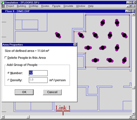 A group of occupants are defined in the same by choosing Menu Item: People > Group People. By clicking with the left mouse button, point by point, a polygonal area will be defined. Click in that area with the right mouse button and the dialogue box Area Properties will appear. It is now possible to add the number of occupants or to define an occupant density for that area. You can turn off the addition of new people, just by clicking onto the same menu item a second time.