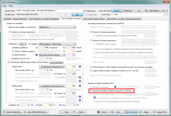 Figure 6: Zone Ventilation & Exhaust tab of the System Parameters dialog with DCV option highlighted