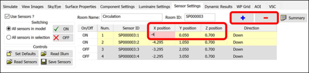 Sensors can also be added and removed using the + and - buttons in the Sensor Settings Tab. The co-ordinates in the table can be adjusted to change the sensors positions and which direction they face.