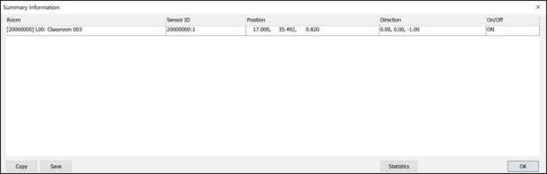 This table can be copied to the clipboard or saved as a .bmp file. The Statistics button creates a .txt file with the total number of sensors, their status (on/off) and their respective spaces.