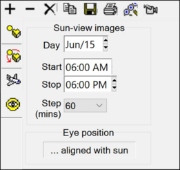 Here the user can generate a series of images at a fixed time interval over the given date from the position of the sun (calculated automatically). As these images are from the sun’s position, they will not show any shading, but surfaces that are fully in view will have a greater solar exposure than those which are viewed obliquely. For example, any windows not visible behind a shading device are fully shaded from direct solar radiation at that time and date.