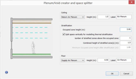 The Plenum/Void creator and space splitter tool is a facility for splitting a selected space along horizontal planes to create voids or plenums at ceiling or floor level and/or to subdivide the space for the purpose of modelling thermal stratification.