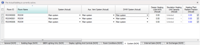 The data grid now shows the assigned data for the Actual Building (note the system values and the editability of the Heating Plant Radiant Fraction values) and the information bar has updated. This happened without any need to directly modify the active tab group in Tabular Space Data.