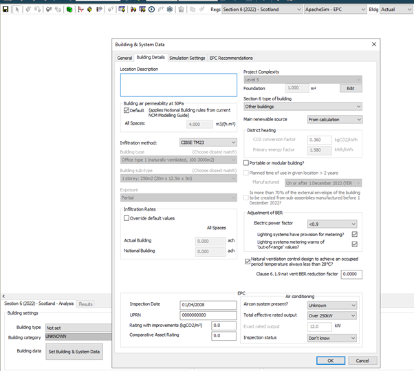 Where the air permeability is to be adjusted, the user to switch to Section 6 (2015 or 2022) – Scotland > ApacheSim – EPC and adjust the default value via the Set Building & System data > Building details dialog. An EPC simulation is to be ran before switching back to ApacheSim – Section 63.