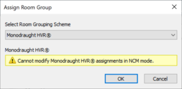 In the VE Compliance view the Monodraught HVR units and logos are not displayed, and their place is taken by provisions compatible with the NCM rules. In this view, it is not possible to modify the assignment of rooms to unit groups. The Assign Room Group window will notify you when this is the case: