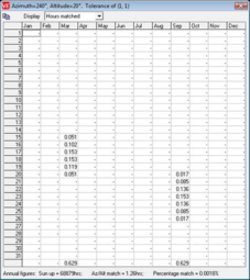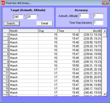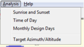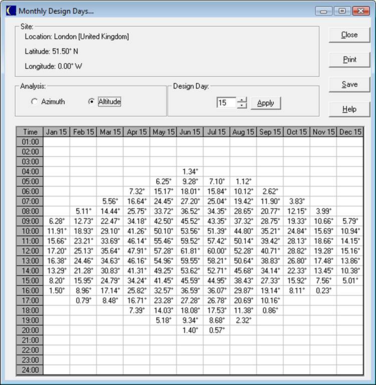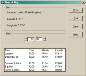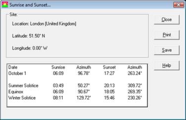 This pop-up window shows the Sunrise and Sunset times for the active design days, i.e. seasons, today, etc., and the Solstices and Equinox.