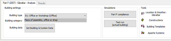 Upon switching to ‘VE compliance’ and selecting the appropriate Regulation type ‘Gibraltar Part F (2007) DSM compliance’, the ‘Analysis’ section at the foot of the Gibraltar compliance view guides users through the compliance framework.