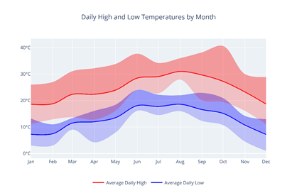• Daily High and Low Temperatures by Month: Displays the statistical max, mean, and min daily temperatures