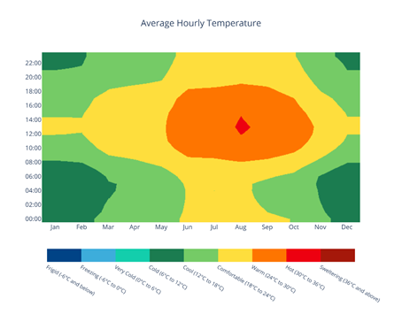 • Average Hourly Temperature: A "carpet plot" showing temperature for each hour of the day averaged across each month, color-coded from Frigid to Sweltering