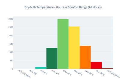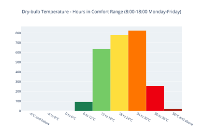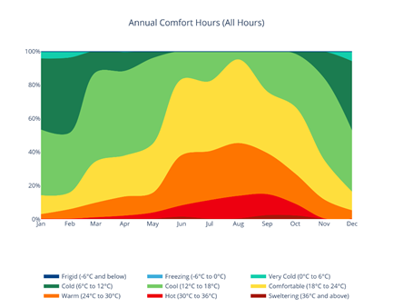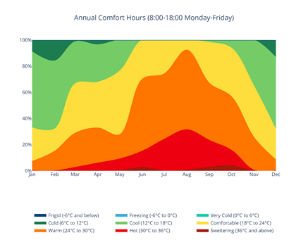 • Comfort Range Analysis: Area graphs detail the number of hours and percentage of time spent in different comfort bands (e.g., "Cool," "Comfortable," "Warm") for both all hours and occupied hours (8:00-18:00 Monday-Friday). These typical occupied hours are pre-defined and fixed. Customized hour ranges can be obtained from VistaPro and the design model if warranted.