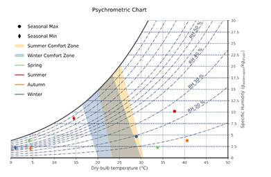 • Psychrometric Chart: Shows the physical and thermodynamic properties of moist air, including seasonal comfort zones based on ASHRAE Standard 55