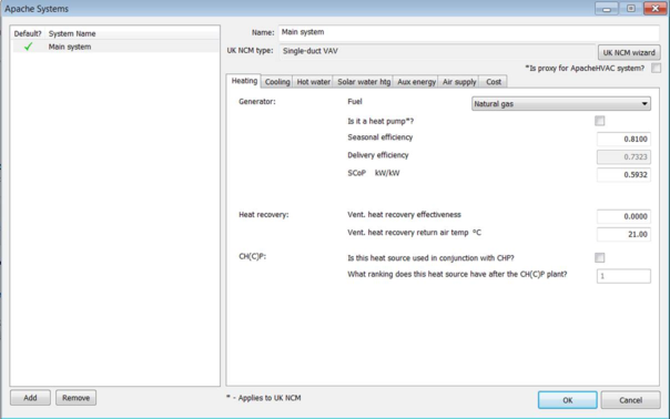 Apache Systems allow you to describe the characteristics of systems supplying heating, domestic hot water, ventilation and air conditioning to rooms. The system specifications entered here are used for sizing central plant and calculating fuel consumption and carbon emissions.