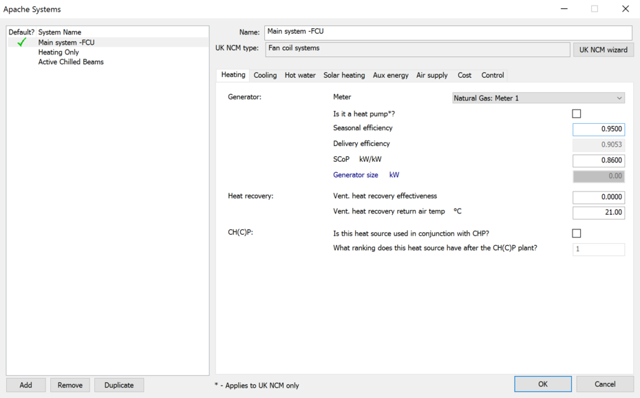 A list displays the Apache Systems in the model. You can add further systems using the ‘Add’ button and remove them (if they are not in use) using the ‘Remove’ button. The properties of the currently selected system are displayed in the main dialog area.