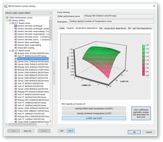 The n ew curves interface provide s exceptional visualization and access to curve parameters. Articulated 3D plot and two different 2D plots are provided for each of Capacity – temperature dependence, EIR – temperature dependence, and EIR – part-load dependence curves.
