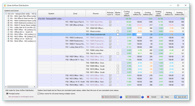 · Users can override this by editing either the distribution percentages or the individual room airflow values, if desired. (Zone-level airflow overrides are provided in the System Parameters and Zones Tabular Edits dialogs where that airflow is otherwise determined.)
