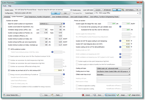 14) View updated derivations as needed in the System Parameters dialog, as the autosizing of the supply fan according to simulated peak coincident flow on each network may have affected these. In some cases, it may be appropriate to override the autosized supply fan flow rate within the System Parameters dialog to match actual fan sizing and to address related engineering checks.