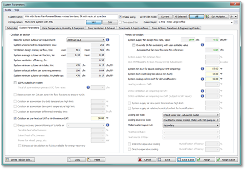14) View updated derivations as needed in the System Parameters dialog, as the autosizing of the supply fan according to simulated peak coincident flow on each network may have affected these. In some cases, it may be appropriate to override the autosized supply fan flow rate within the System Parameters dialog to match actual fan sizing and to address related engineering checks.