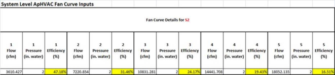 Entering a number in the spreadsheet for “A” will revise the fan efficiency for each of the five data points for Fan component (e.g., SA fan component S2 on the Sys 5,7 tab, as highlighted in the S2 table from that tab below). The static pressure values for the baseline supply fans will remain unchanged (e.g., at 2.0 i.w.c.). Because TSP is held constant in this calculation, and because the baseline SA fan power is accounting for ALL fans, other than parallel fan-powered boxes, in the baseline system, the resulting efficiency values will appear remarkably low, as in this example: