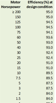 During System-level sizing, Motor Efficiency at Design Flow Rate for SA fans in PRM Baseline systems 3–8 and 11 is provided by the following lookup table of values from ASHRAE 90.1-2007 Table 10.8 Enclosed Motors column 4: