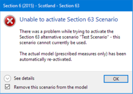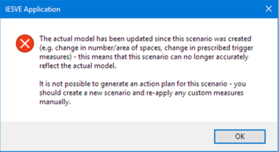 The most common cause of this would be modifying the geometry or building data of the original source model after the scenario was created (adding new rooms, deleting or changing the area of existing rooms, changing the EPC data in Building & System Data), or by modifying the data in the original source model such that it now uses a different set of triggered prescriptive improvement measures to that in scenario. In these cases, the scenario no longer accurately represents the same building, so you cannot use it for Section 63 analysis.