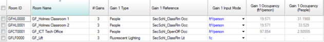 The first three rooms in the grid all have a people gain as their first gain, but the last (a lift) has a fluorescent lighting gain as its first gain. For this reason, care must be taken to ensure that modifications applied across multiple gains are correctly applicable as you expect.