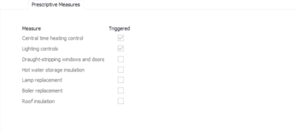 The tab includes a “triggered” checkbox for each of the prescriptive improvement measures listed previously – each is labelled with an abbreviated version of the measure. When a checkbox is ticked, the associated measure has been identified as being applicable to your building model and will be included when performing the Section 63 assessment to calculate the target annual savings for CO2 emissions and energy usage. Note that you cannot manually change the ticked state of these checkboxes – it is derived from the settings in the building model.