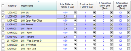 The process for editing a value across multiple rooms at once is the same as that outlined for the various cell-types above – the only difference is that before you perform the edit, you mark the rooms you want to apply the change to. You can mark a room by clicking its marking checkbox at the left-hand side of the grid.