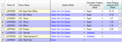 If you attempt to modify the value of Fixed Heating Capacity for room L01: NW Office to 5.1, the change will only be applied to the rooms L01: NW Office, L00: Office and L01: Room. It would not be applied to L01: Servers because that room is using “Unlimited” for its Simulation Heating Unit Capacity. Similarly, the change would not be applied to L02: Roof Void either – this is because that room has no main system, therefore the options for heating capacity are unavailable.