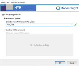 To create a new .asp file containing the HVR assignments, click on the New HVAC system button and enter a unique name (excluding the .asp extension) for the new file. If the name is valid, a green tick () will be displayed to the right of the text field – otherwise, it will display a red cross (). You can hover over the red cross for details on why the name cannot be used. When you click OK, the .asp file will be created with the name you entered.