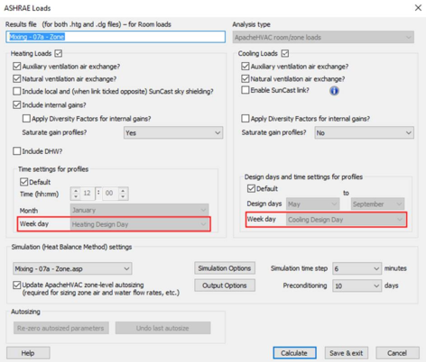 These design day profiles are the default reference in the Room & Zone loads and System Loads dialogs. By unchecking the “Default” box in the loads dialog for heating and/or cooling loads, users can select a day of the week for use in load calculation runs in place of the design day profiles if desired.