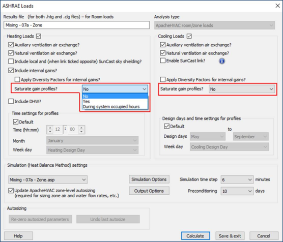 Once internal gains are included (optional for heating loads, always included for cooling loads) then the user has the ability to set saturation conditions for these gains. Here we will discuss the ability to saturate internal gains both for heating and cooling loads runs.