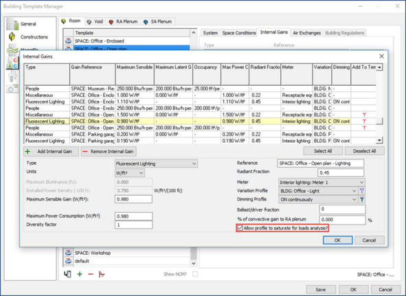 Figure 2 - 3 : Internal gains dialog, accessed from the Building Template Manager, with the option to allow profile saturation for loads analysis engaged